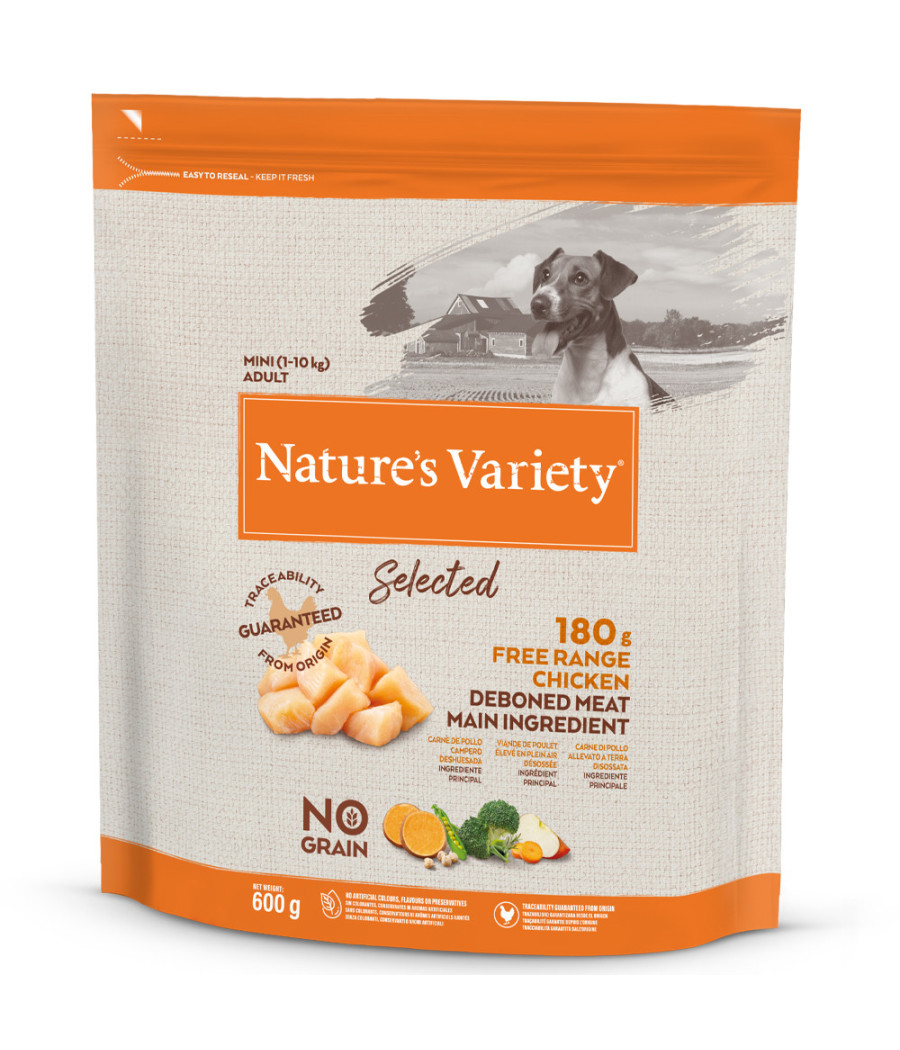 Alimento seco, elaborado com carne de frango de capoeira desossada como ingrediente principal. Combinado com frutas e legumes cuidadosamente selecionados, e fontes naturais de hidratos de carbono alternativos.