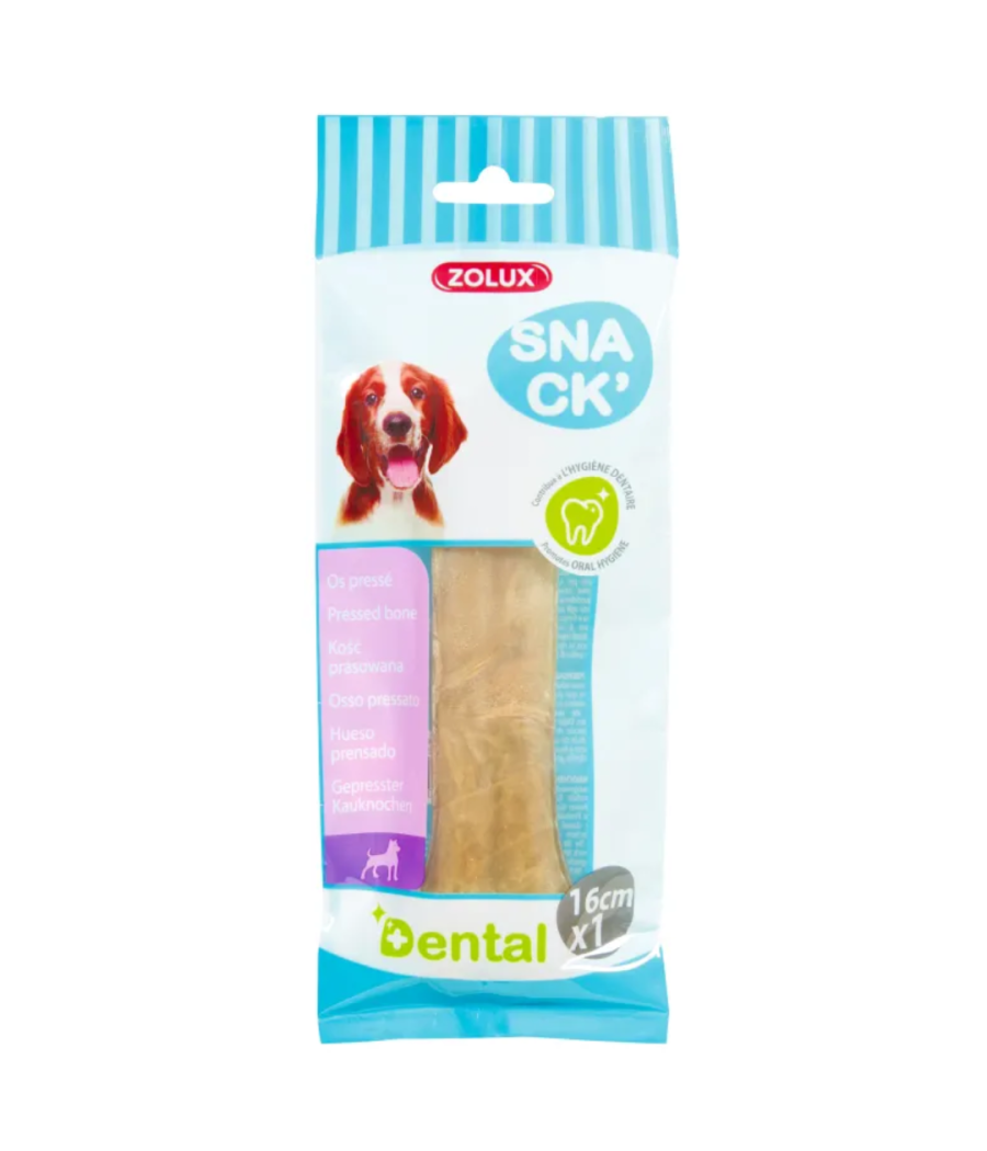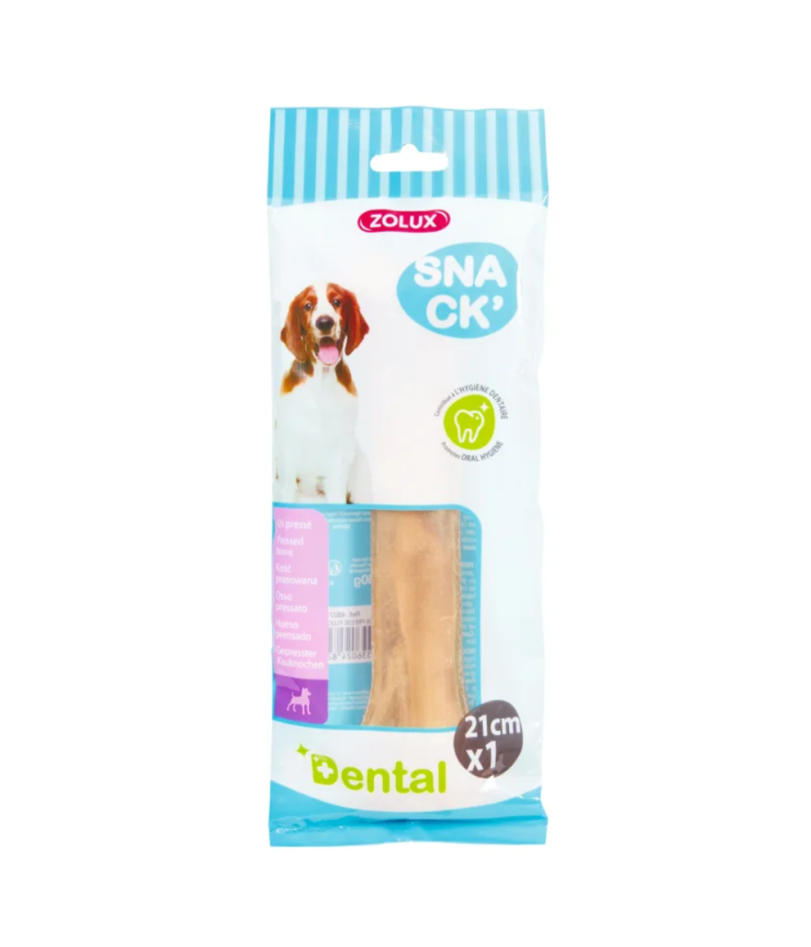 O osso mastigável prensado com flúor para cães é uma guloseima composta de 99,99% de pele bovina e 0,01% de flúor. Esta guloseima natural contribui para a higiene dentária através do efeito mastigatório.
