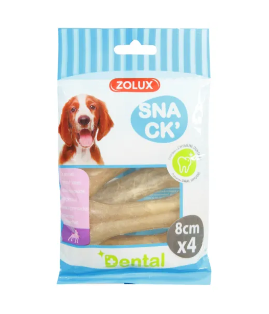 O osso mastigável prensado com flúor para cães é uma guloseima composta de 99,99% de pele bovina e 0,01% de flúor. Esta guloseima natural contribui para a higiene dentária através do efeito mastigatório.