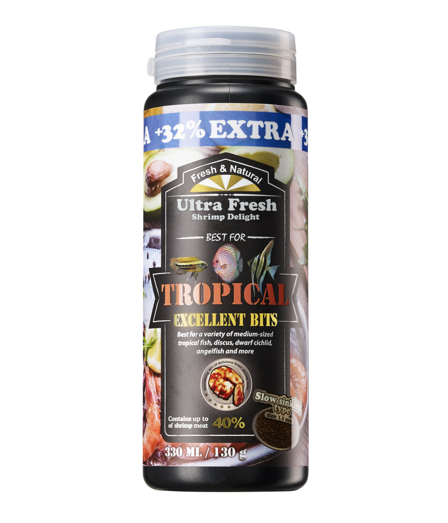 Formulado com alto conteúdo de camarões espada selvagens (até 40%), alho, lulas frescas, além de uma mistura de ingredientes naturais selecionados, este alimento para peixes apresenta alta palatabilidade e valor nutricional para peixes de médio porte, ciclídeos anões, discus e escalares. 10 horas de processamento a baixa temperatura e reforçada com probióticos intestinais, preserva os sabores naturais e valores nutricionais ricos dos ingredientes frescos. Inclui mariscos frescos, spirulina, alho, ganoderma e polissacarídeos, oferecendo uma nutrição proteica natural. É projetado para ser rapidamente amolecido uma vez na água, mas não se desintegra e não turva a água. A ingestão fácil pelo peixe ajuda a fácil digestão e completa absorção de nutrientes, reduzindo assim a excreção de resíduos.