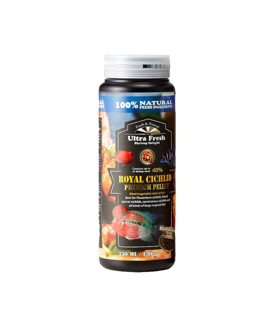 Formulado com alto conteúdo de camarões espada selvagens (até 40%), alho, lulas frescas, além de uma mistura de ingredientes naturais selecionados, este alimento para peixes apresenta alta palatabilidade e valor nutricional para peixes de médio porte, ciclídeos anões, discus e escalares. 10 horas de processamento a baixa temperatura e reforçada com probióticos intestinais, preserva os sabores naturais e valores nutricionais ricos dos ingredientes frescos. Inclui mariscos frescos, spirulina, alho, ganoderma e polissacarídeos, oferecendo uma nutrição proteica natural. É projetado para ser rapidamente amolecido uma vez na água, mas não se desintegra e não turva a água. A ingestão fácil pelo peixe ajuda a fácil digestão e completa absorção de nutrientes, reduzindo assim a excreção de resíduos.