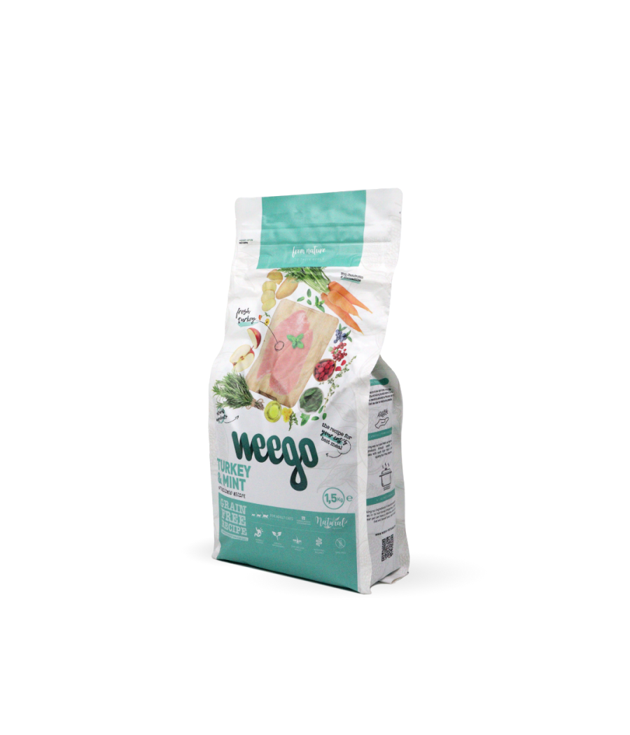 Alimento seco, natural, completo e equilibrado, sem cereais, à base de peru adaptado para gatos seniores, esterilizados ou com excesso de peso, de qualquer raça ou tamanho.