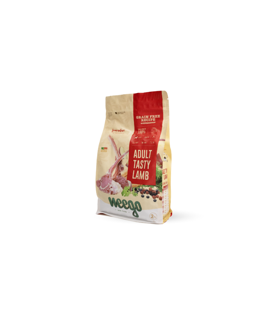 Alimento seco, natural, completo e equilibrado, sem cereais, à base de borrego e adequado para cães adultos de qualquer raça ou tamanho.